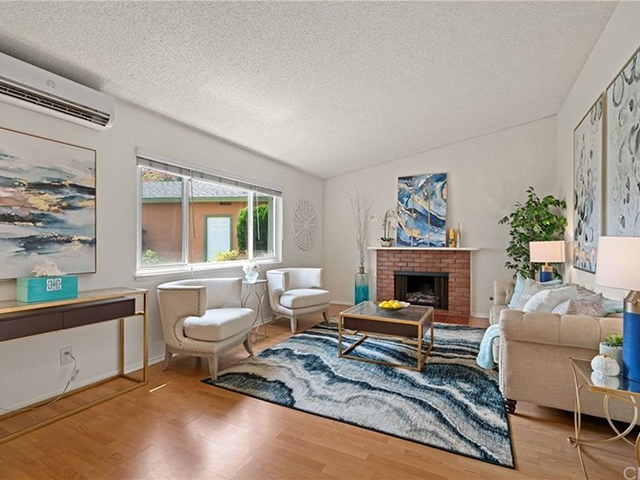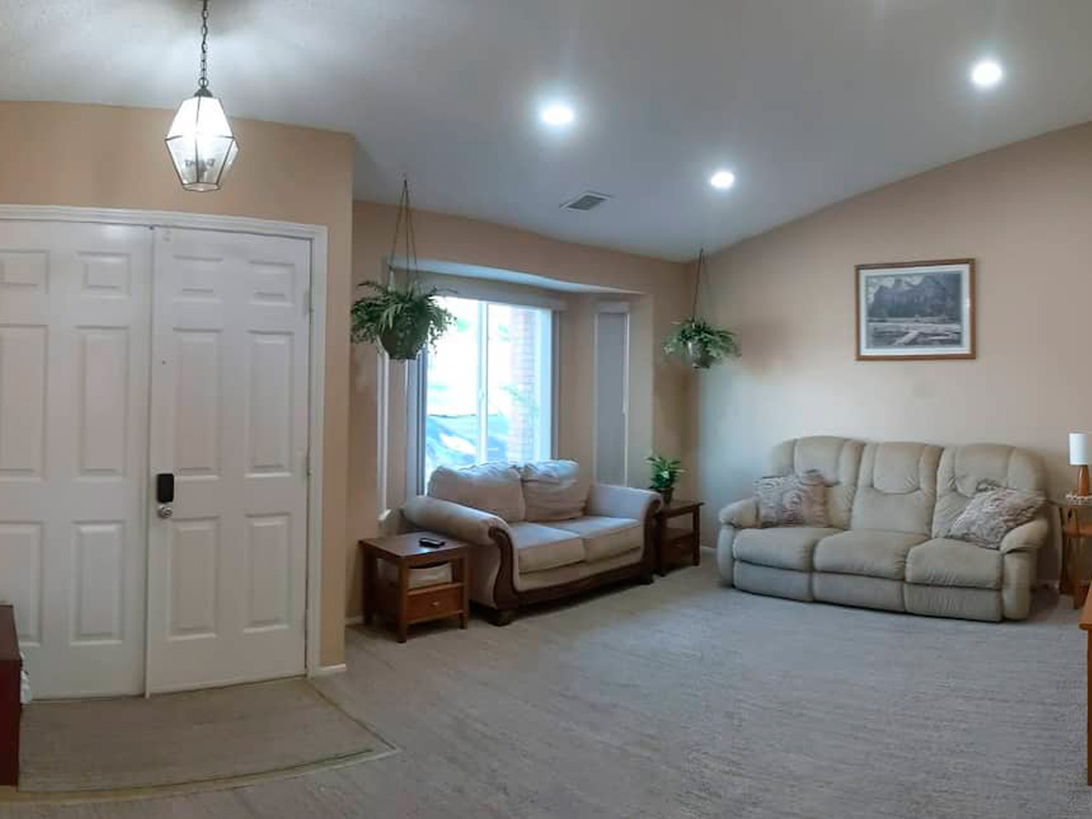 The family room is open and spacious with vaulted ceilings. Skylight in the living room entry way, letting natural light in all day. Large counter space and bar in the kitchen.